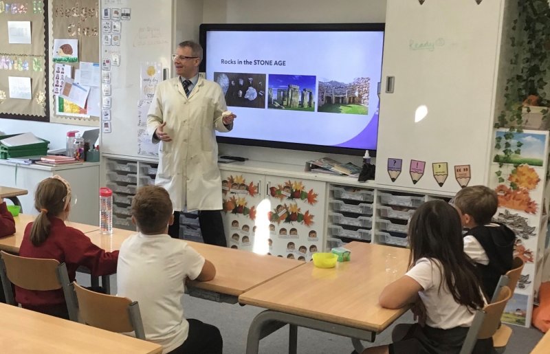 Dr Wilson, our Head of Science, visited Hedgehog and Squirrel Year 3 pupils at Melbourn Primary School last week to talk about rocks! They have been learning how our ancestors used rock tools to hunt and build. Dr Wilson talked to them about two properties of rocks - 'Does this rock react with acid?' and 'How soft is this rock?' The pupils were very excited to see and hear the bubbles when chalk reacted with acid. Dr Wilson will be visiting our other feeder primary schools over the course of this year.