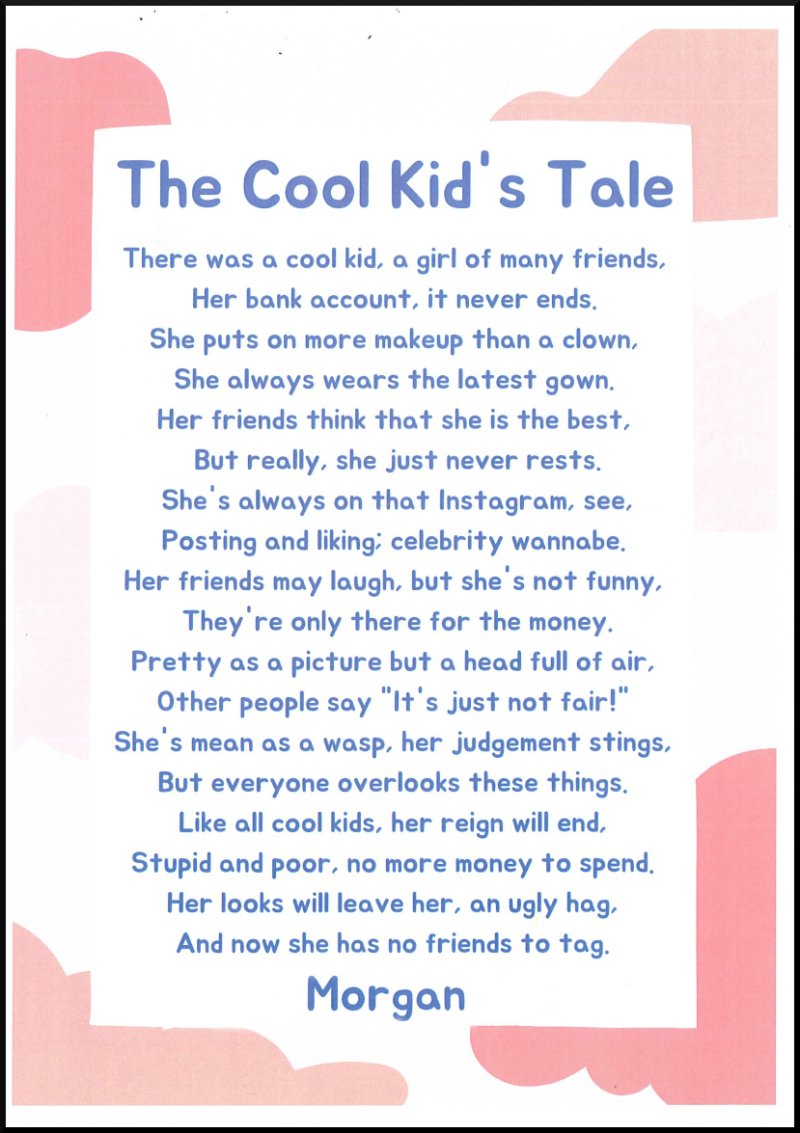 Year 8s have been looking at writing their own modern versions of character descriptions, bringing them right up to date. Morgan has completely understood the assignment with his fantastic description of a cool kid. Ms Seagrove was super impressed!